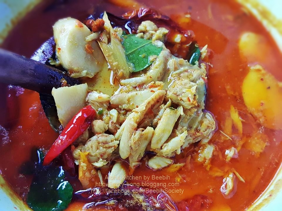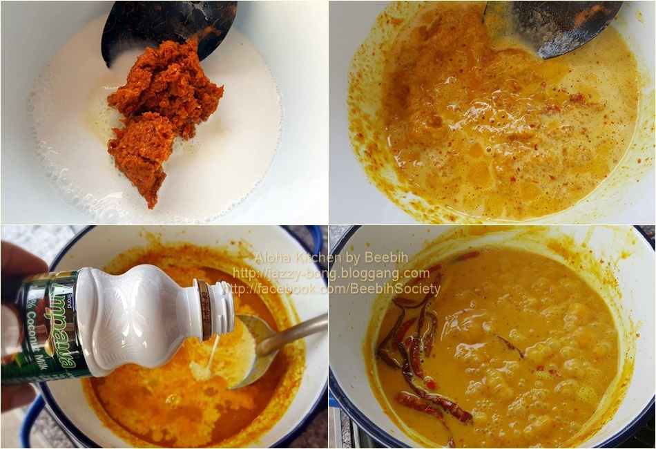 1) นำหัวกะทิ 1 ถ้วย และหางกิทะ 2 ถ้วย ผสมรวมกันในหม้อยกขึ้นตั้งเตาไฟปานกลาง พอกะทิเดือดปุดๆ ใส่พริกแกงที่โขลกลงไปคนผสมให้เข้ากัน หมั่นคนจนกระทั่งส่วนผสมเดือด เคี่ยวจนมีกลิ่นหอม