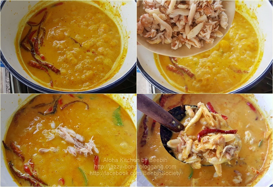 3) แบ่งใส่เนื้อปูบางส่วนใส่ไป เนื้อปูอีกส่วนสำหรับโรยหน้าตอนเสิร์ฟ