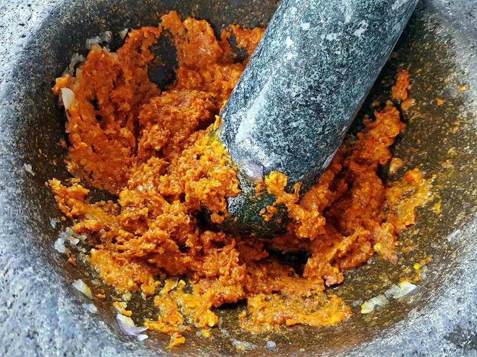 *** นำส่วนผสมทั้งหมดใส่ในครก โขลกรวมกันให้ละเอียด พักรอไว้