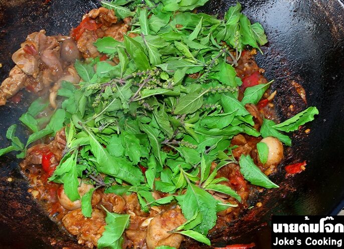 -ผัดต่อจนเครื่องในสุกและน้ำแห้งได้ที่ตามต้องการ ใส่ใบกะเพราลงไปผัดจนหอมได้ที่