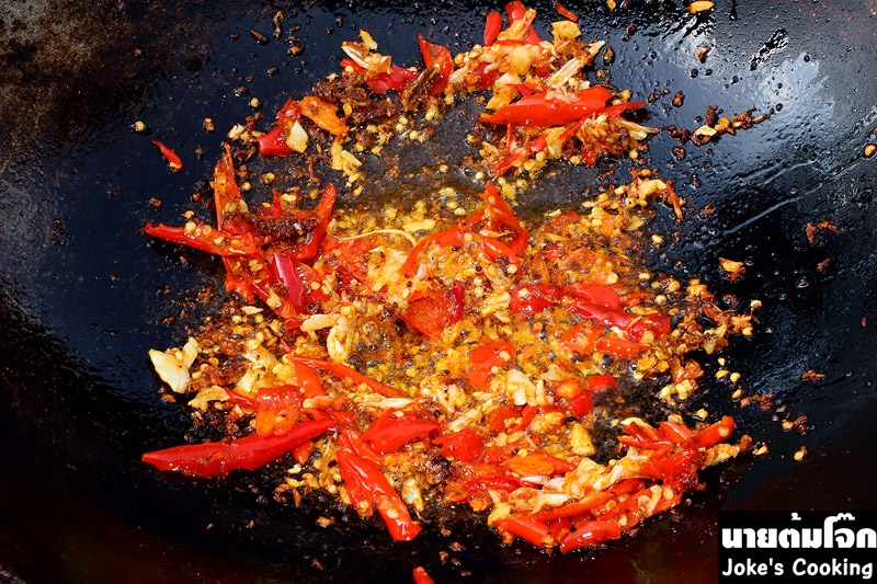 -ตั้งกะทะใส่น้ำมันจนน้ำมันร้อน นำเครื่องผัดที่โขลกไว้ลงไปผัดจนเหลือหอม