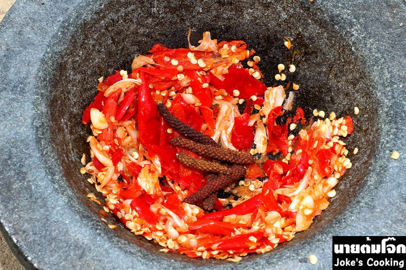 -โขลก พริก,กระเทียม,และดีปลี ให้แหลกเข้ากัน