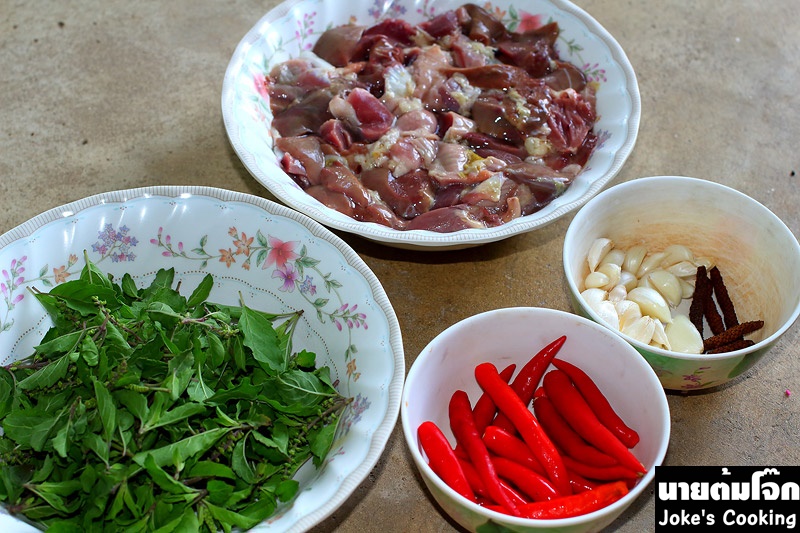 -ล้างและหั่นเครื่องในไก่ให้สะอาดและพักไว้