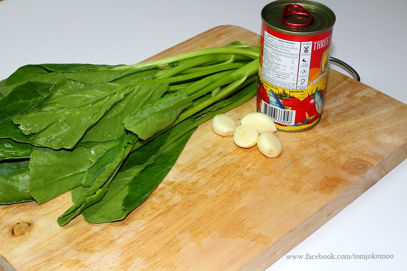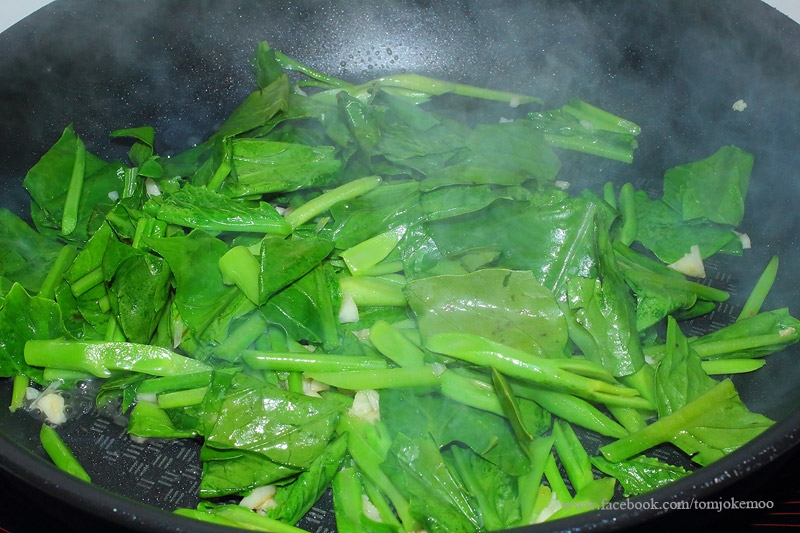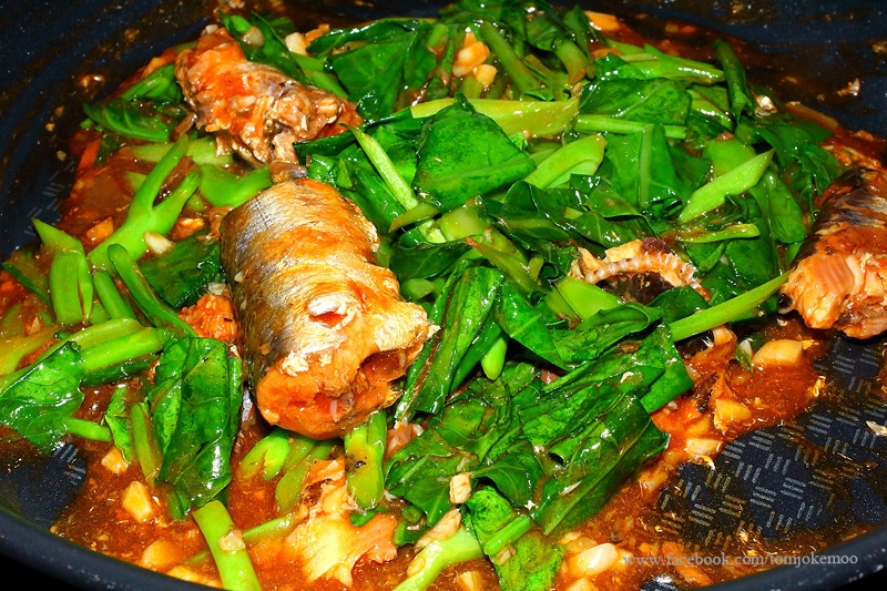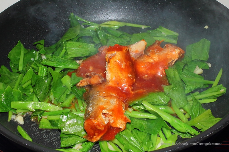 3.ใส่คะน้าลงไปผัด ใส่น้ำนิดหน่อย และตามด้วย ปลากระป๋อง