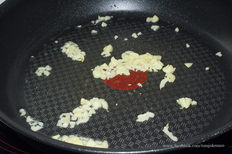 2.ใส่กระเทียมที่เราซอยไว้ลงไปผัดจนเหลืองหอม