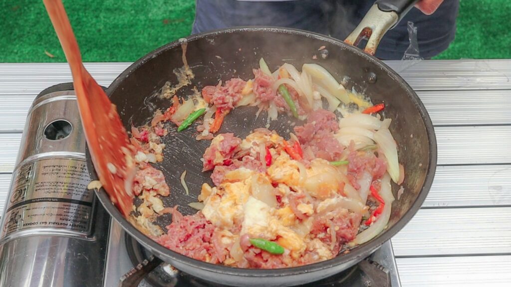 2.จากนั้นยีแหนมแล้วลงไปผัด ให้หอมตามด้วยหอมใหญ่ พริกขี้หนูสับ ผัดรวมกัน และไข่ไก่ ผัดจนไข่สุก
