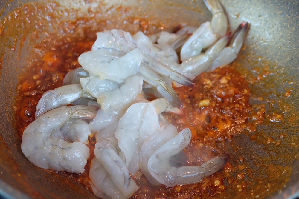 -พอกระเทียมเริ่มเหลือง ใส่มันกุ้งที่เตรียมไว้ ใส่เครื่องปรุงทั้งหมดลงผัด ผัดให้เข้ากันดีใส่กุ้งลงผัดจนสุก