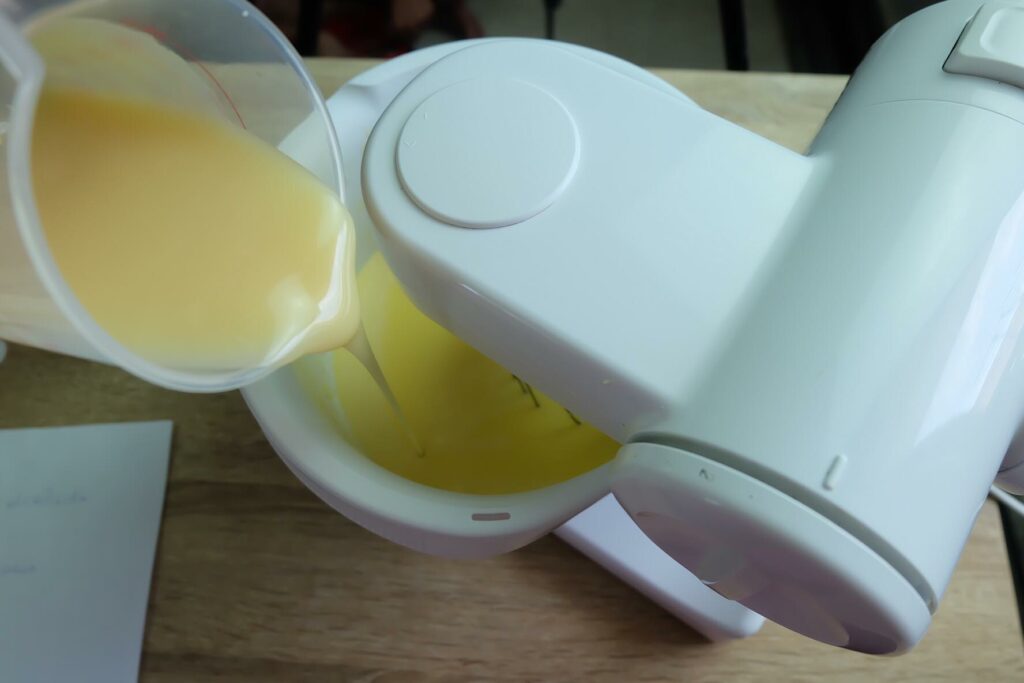 -เมื่อตีส่วนผสมเข้ากันดีแล้วให้ใส่นมข้นจืด+นมข้นหวาน+เกลือ+วนิลา ตีต่อให้ส่วนผสมเข้ากัน