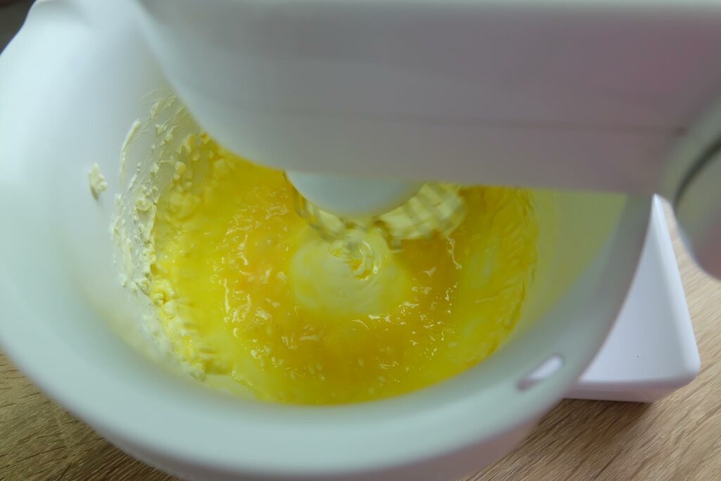 -จากนั้นค่อยๆใส่ไข่ทีละฟองตีให้เข้ากันจนครบ5ฟอง