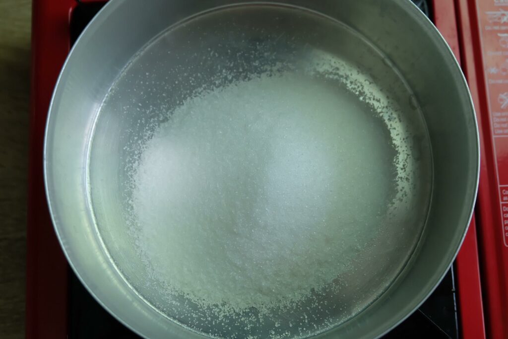 -นำน้ำตาลใส่พิมพ์ตั้งไฟอ่อน เกลี่ยน้ำตาลให้ทั่วพิมพ์ ให้น้ำตาลค่อยๆละลายเป็นสีน้ำตาล
