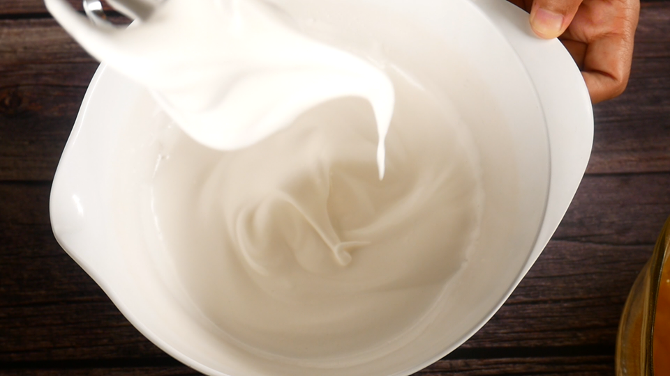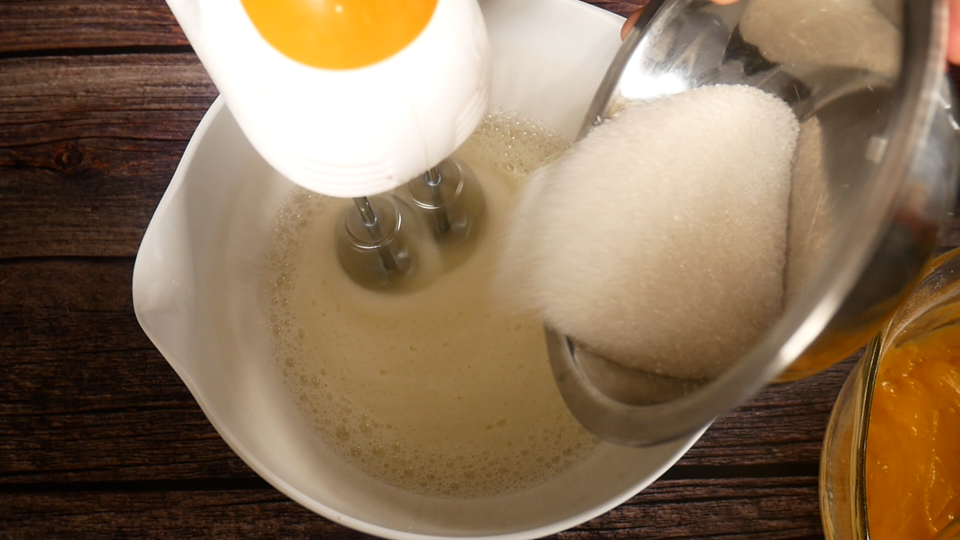 3. ตีไข่ขาว และน้ำมะนาวให้เป็นฟองหยาบด้วยเครื่องตีไฟฟ้า หรือตะกร้อตีไข่ หลังจากนั้นทยอยใส่น้ำตาลทรายสลับกับการตีจนน้ำตาลหมด ตีต่อจนไข่ขาวขึ้นฟูตั้งยอดอ่อน