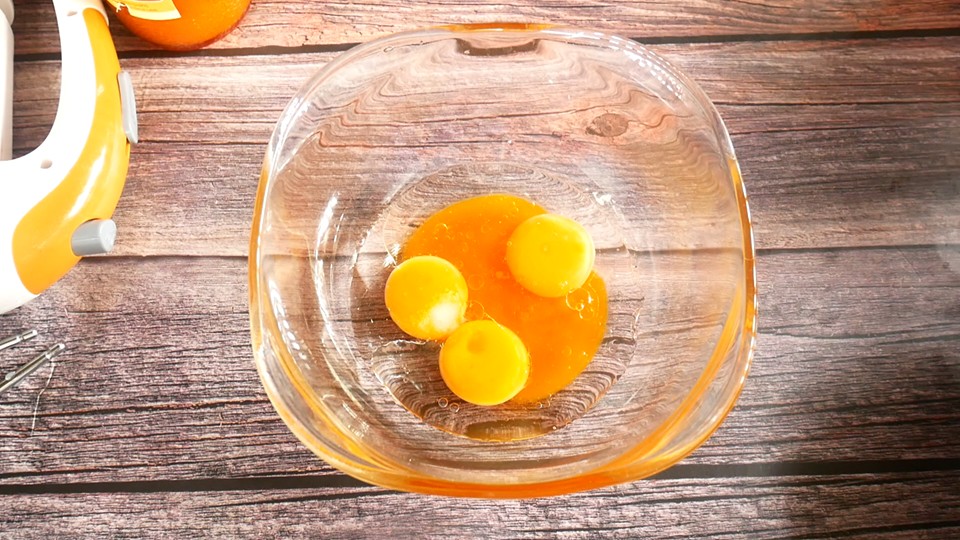 1.ใส่ไข่แดง เกลือ น้ำมัน น้ำเปล่า น้ำส้มเข้มข้น ลงในชามผสม คนให้เข้ากัน