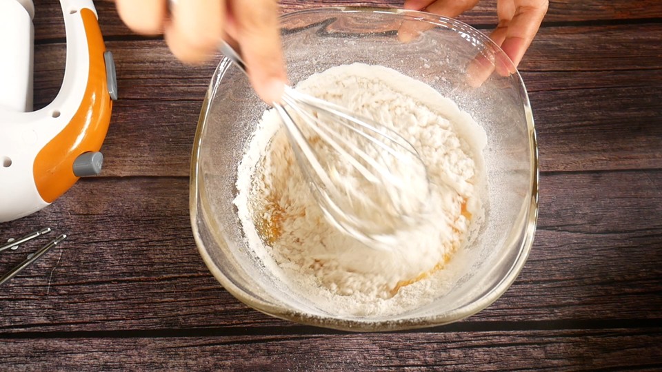 2. ร่อนแป้งและเบคกิ้งโซดา ใส่ลงไปในชามผสม คนให้เข้ากัน ให้แป้งละลายไม่เป็นเม็ดแป้งขาวๆ ใส่กลิ่นวนิลาคนให้เข้ากันพักไว้