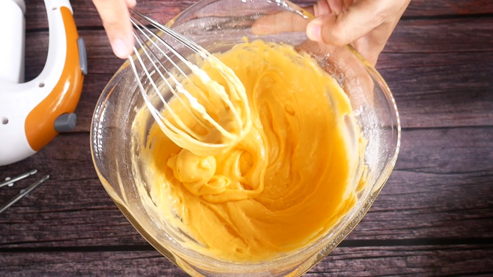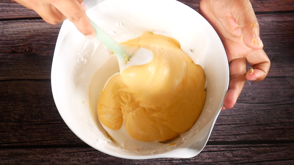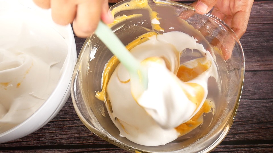 4.หลังจากตีไข่ขาวจนขึ้นฟูแล้ว ให้ตักแบ่งไข่ขาว 1 ส่วน ผสมลงในส่วนของไข่แดงที่พักไว้ หลังจากนั้นตะล่อมให้เข้ากัน ทำแบบนี้จนไข่ขาวหมด