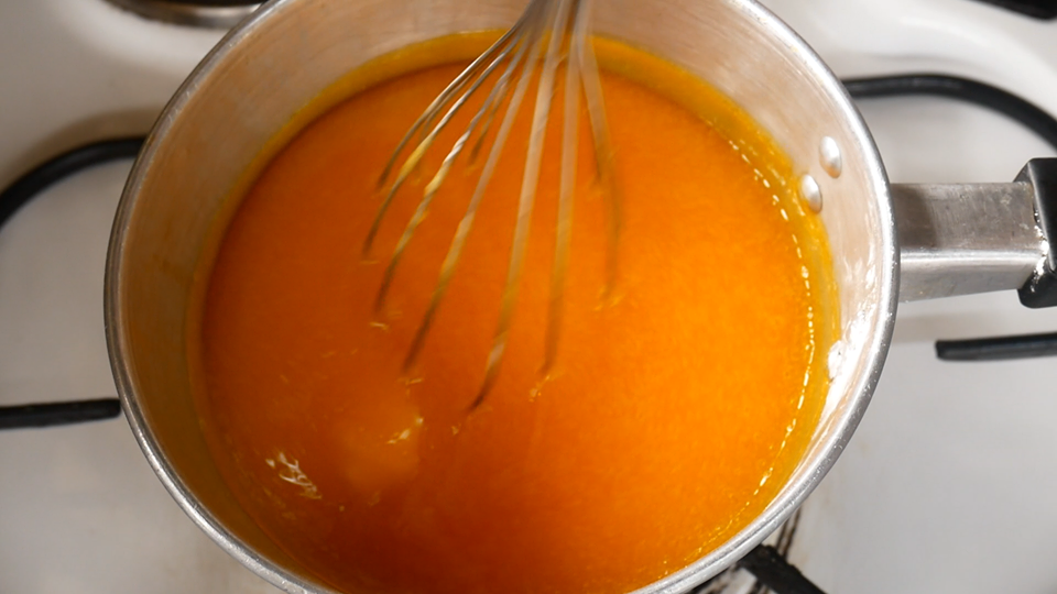 7.ในส่วนของน้ำซอส ให้ผสมส่วนผสมทุกอย่างรวมกันลงในหม้อ ยกเว้นเนย นำขึ้นตั้งไฟใช้ไฟปานกลาง คนจนซอสมีลักษณะข้นหนืดเป็นรูปตะกร้อ แล้วจึงปิดไฟ ใส่เนยสด คนให้เข้ากัน
