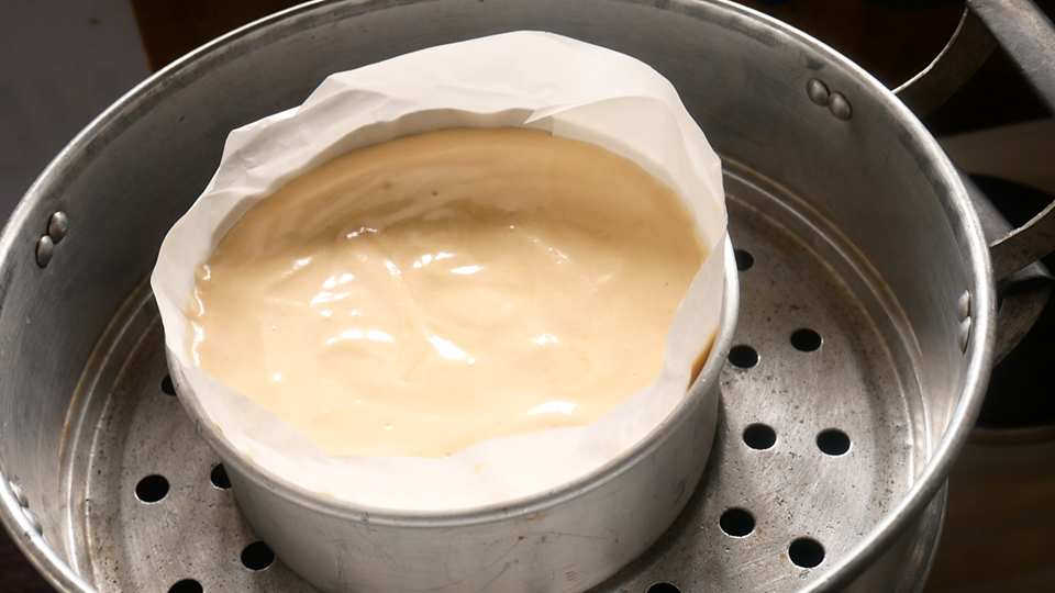 6. นำลงซึ้ง นึ่งด้วยความร้อนปานกลางประมาณ 30 นาทีหรือจนกว่าจะสุก เช็คสุกโดยการนำไม้จิ้มฟันจิ้มที่เนื้อเค้ก ถ้าไม่มีเศษเค้กติดไม้ แสดงว่าสุกแล้ว หลังจากนั้นยกลงพักให้อุ่น