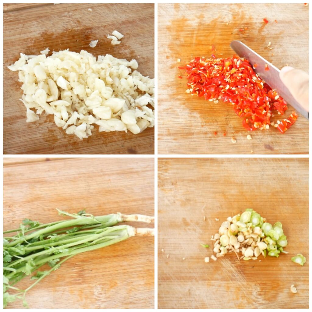 3. นำผักชีล้างน้ำให้สะอาด ตัดส่วนรากมาสับให้ละเอียด ส่วนใบและก้านซอยเตรียมไว้
