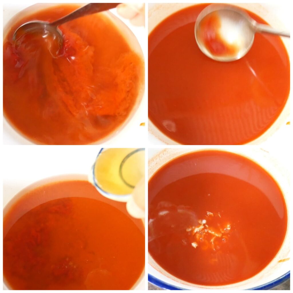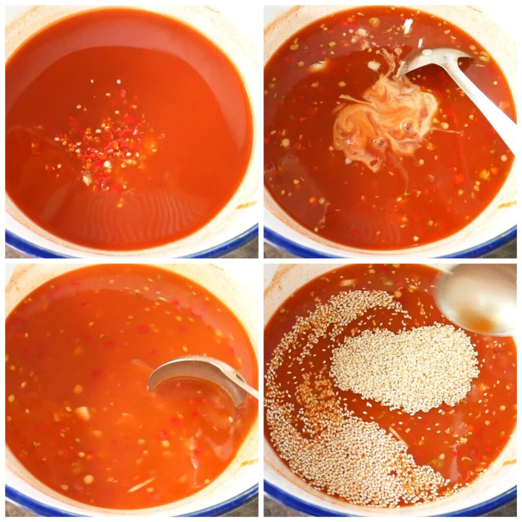 4. นำน้ำเปล่า ซอสพริก ซอสมะเขือเทศ น้ำตาลทราย เกลือ น้ำกระเทียมดอง และน้ำส้มสายชู ใส่ลงในหม้อ คนผสมให้เข้ากัน และชิมรสตามความชอบ