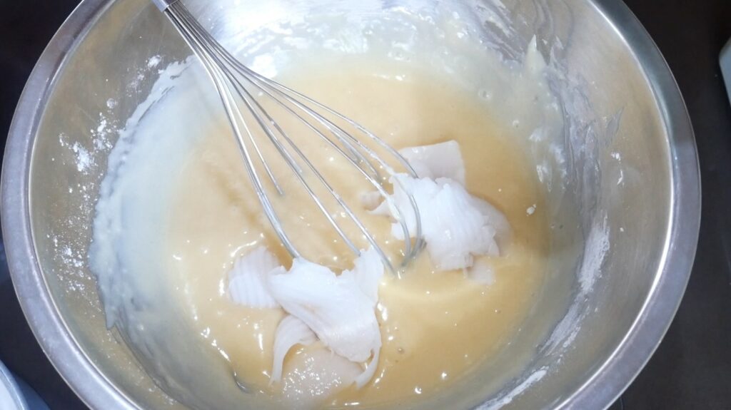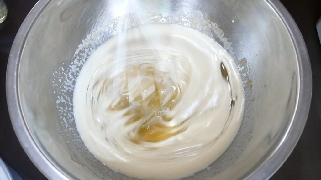 2.ใส่น้ำมะพร้าว กะทิ เกลือ น้ำมัน กลิ่นมะพร้าว คนให้เข้ากัน พักไว้
