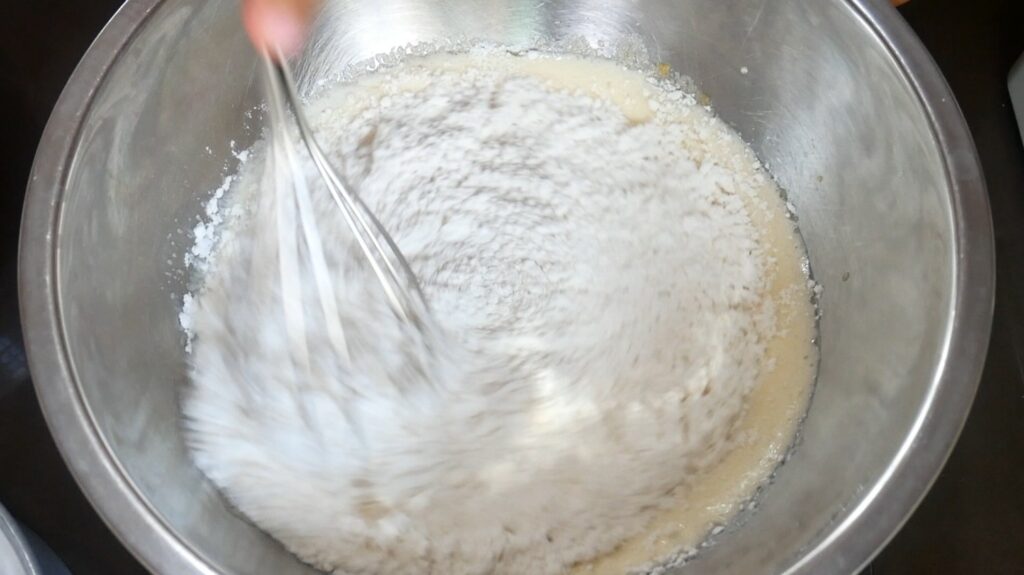3. ร่อนแป้งและเบคกิ้งโซดา แล้วใส่ลงในส่วนผสมเมื่อซักครู่ คนให้เข้ากันไม่ให้เห็นเม็ดแป้ง