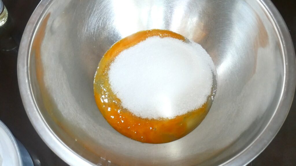 1.ใส่ไข่และน้ำตาลลงในชามผสมคนให้เข้ากันให้น้ำตาลทรายละลาย