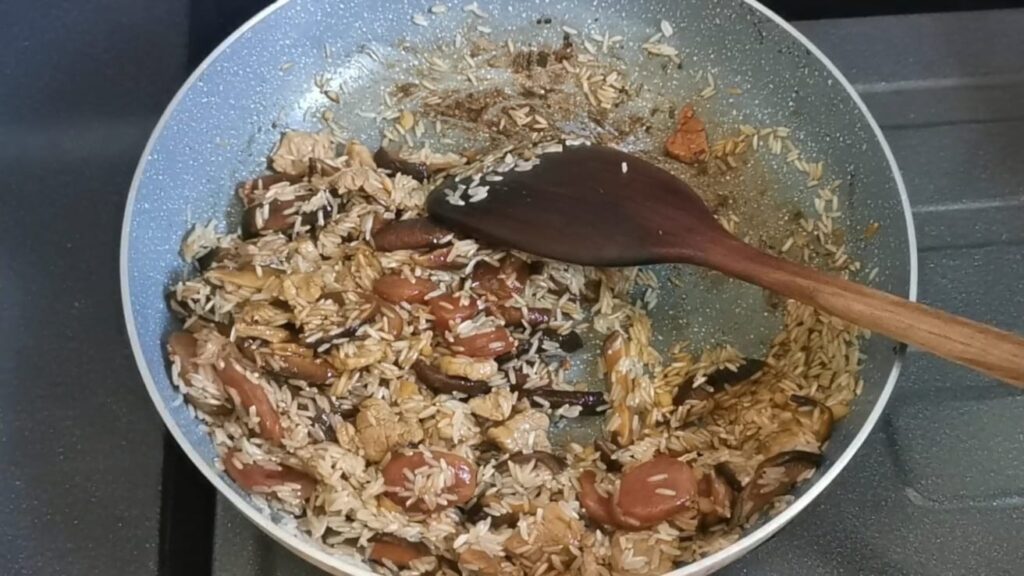 -ผัดทุกอย่างจนเข้ากันดี ก็ใส่ข้าวสารลงไปผัดต่อ