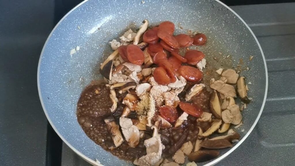 -ตามด้วยเห็ดหอม กุนเชียง แล้วปรุงรส ชิมเอารสชาติตามชอบได้เลยค่ะ แต่ควรปรุงให้เข็มนิดนึง เพราะเดียวใส่ข้าวแล้วรสชาติจะอ่อนลงอีกหน่อย