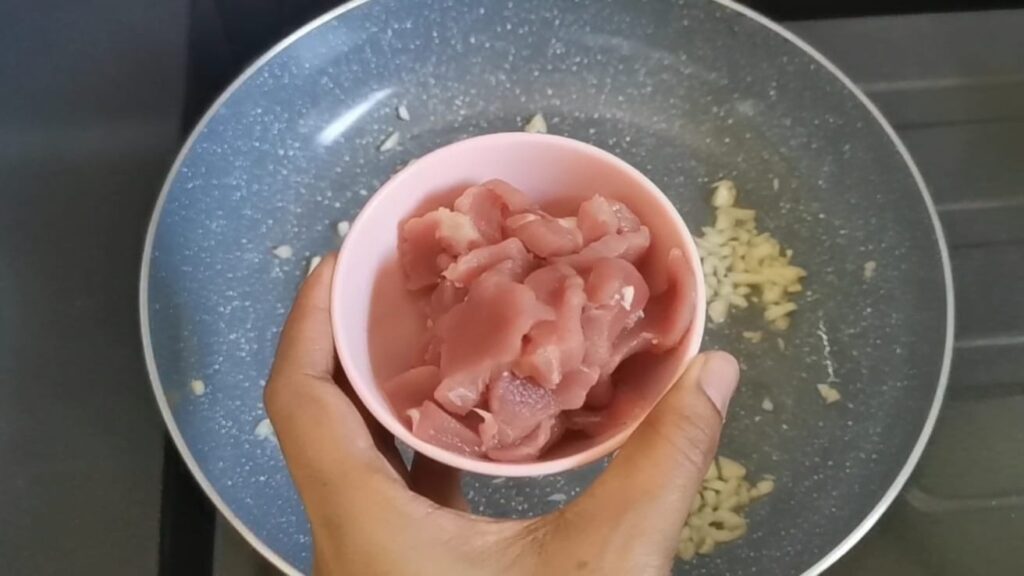-นำกระเทียมมาผัดให้หอม เมื่อหอมแล้วใส่หมูลงไปผัดให้พอสุก