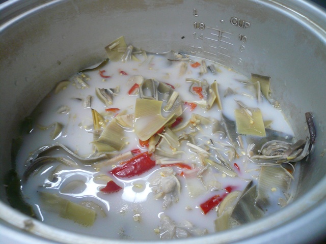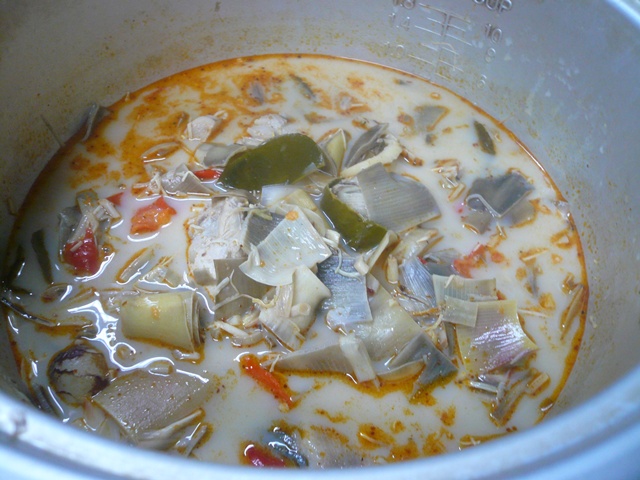 -รอให้เดือด แง้มฝาหม้อไว้ เคี้ยวไปเรื่อย ๆ จนไก่และหัวปลีเปื่อยนุ่มตามที่เราต้องการ ระหว่างนี้ก็เติม น้ำปลาเกลือ ปรุงรสให้ออกเค็มนิด ๆ ใส่พริกขี้หนูบุบลงไป