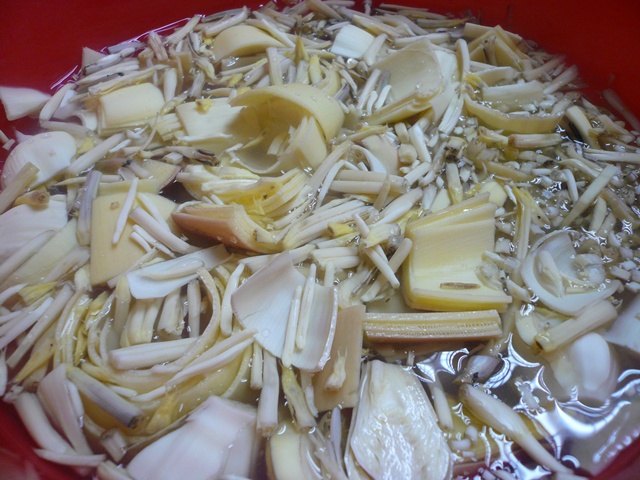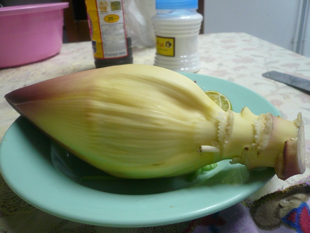 -เรามาเตรียมหัวปลีกันค่ะ หัวปลี เราลอกเปลือกแก่ ๆ ออกเหลือแต่สีเหลืองอ่อน ๆ ข้างใน