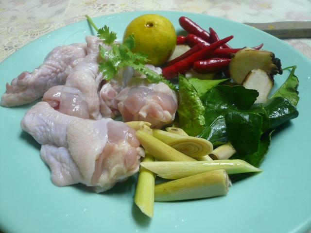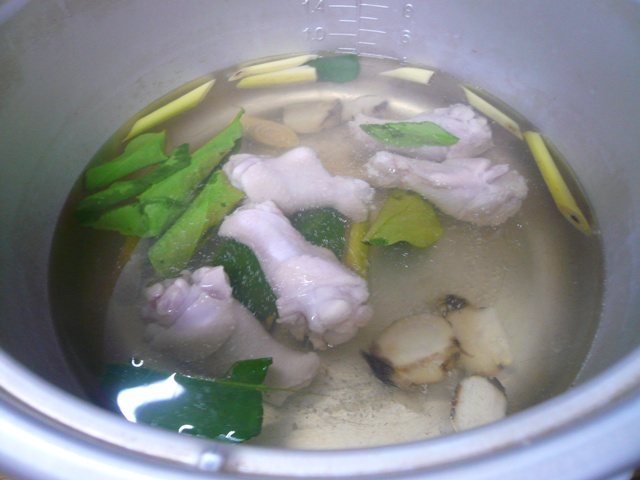 -เตรียมเครื่องโดย ล้างน่องไก่ให้สะอาด ผึ่งให้สะเด็ดน้ำ เครื่องต้มยำและอื่น ๆ เราก็ล้างให้สะอาด หั่นเป็นชิ้น ๆรอไว้