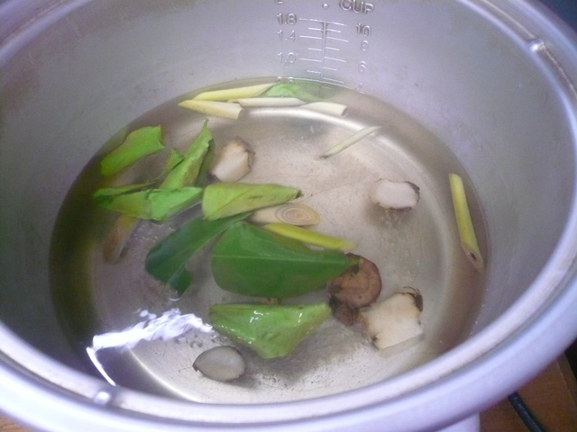 -จากนั้นใส่เครื่องต้มยำ มี ข่า ตะไคร้ ใบมะกรูด ลงไป รอให้เดือดอีกครั้ง