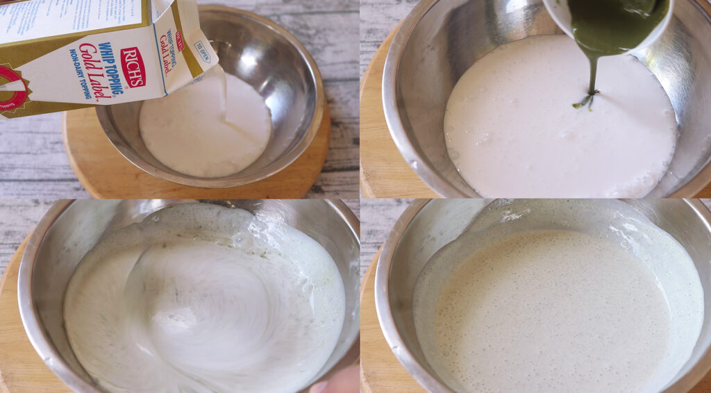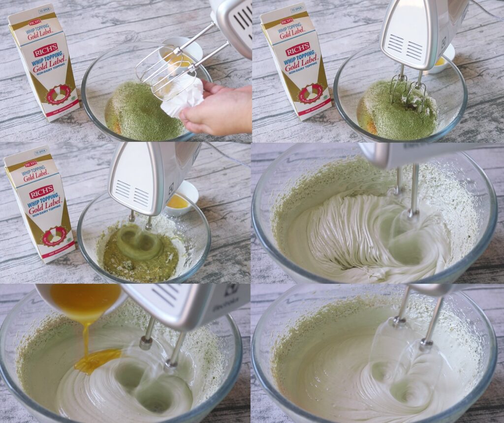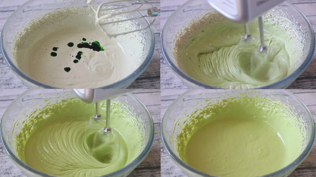 3. จากนั้นใส่สีเขียวลงไป ตีให้เข้ากัน