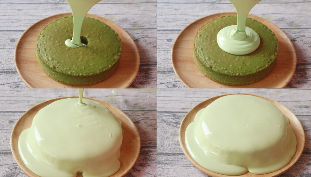 10.ใส่สีเขียวลงไป ผสมให้เข้ากันแล้วนำครีมมาราดลงไปบนเค้ก