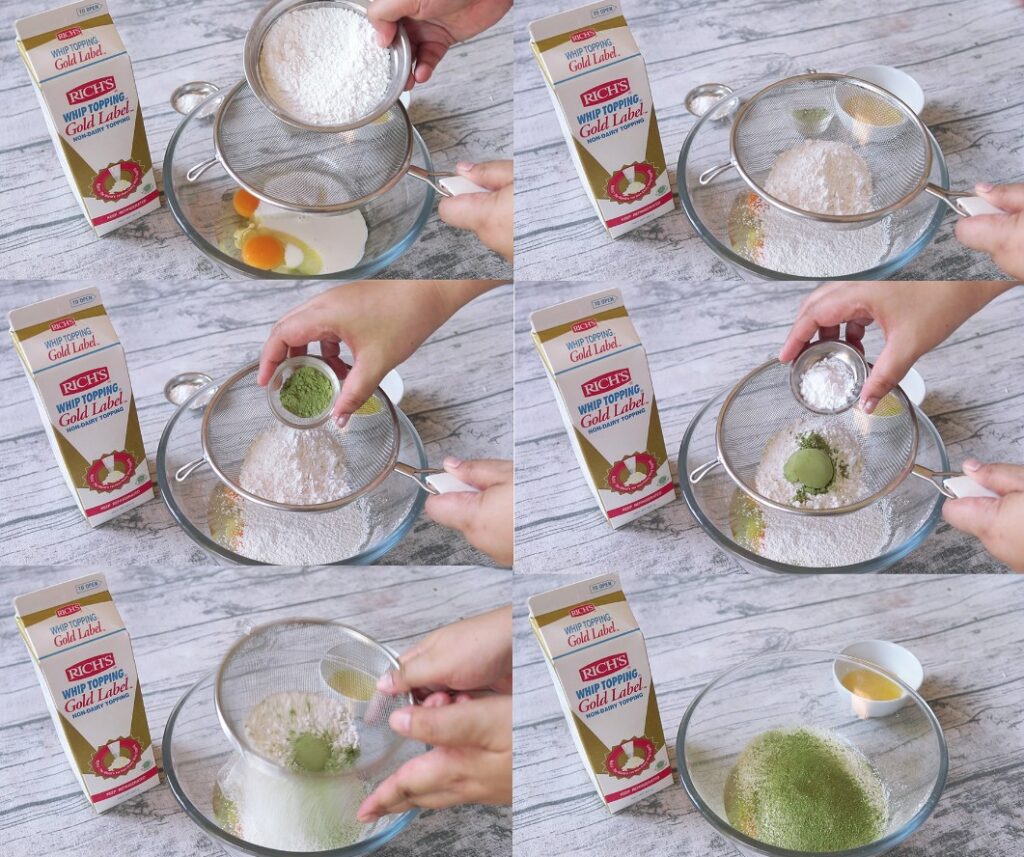 1.ใส่ไข่ไก่ น้ำตาลทราย เกลือป่น นมจืด และร่อนแป้งเค้ก+ผงชาเขียว+ผงฟู ลงไป
