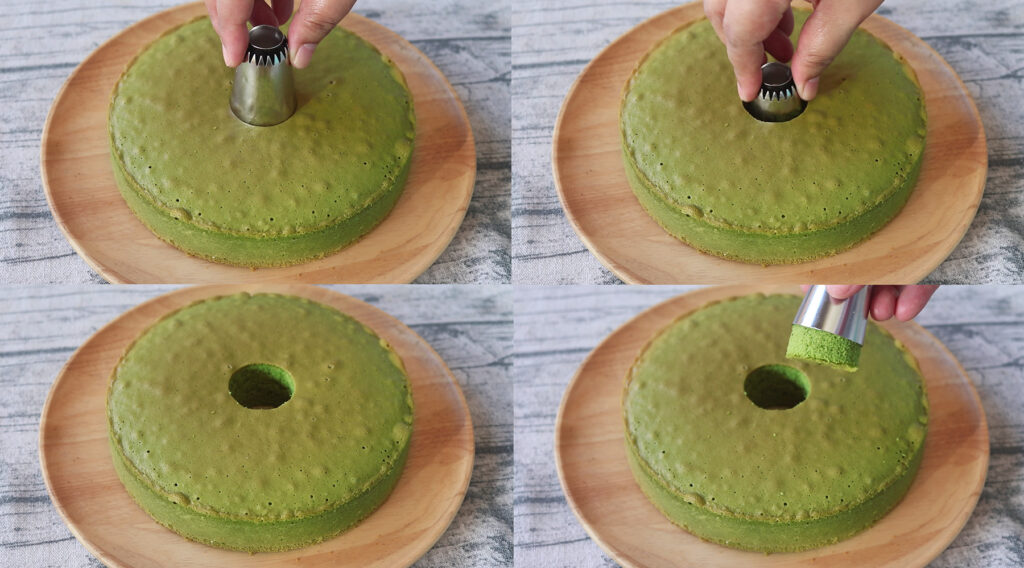5.เมื่อเค้กเย็นแล้ว นำมาเจาะรูตรงกลาง ตามภาพ