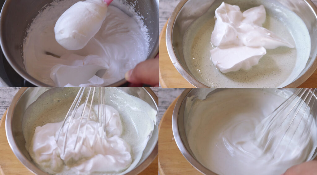 9.จากนั้น แบ่งวิปครีมที่ตีจนตั้งยอดแข็ง นำมาผสมในชามวิปปิ้งครีมที่ยังไม่ตี ผสมจนได้ความข้น เหลว ตามต้องการ