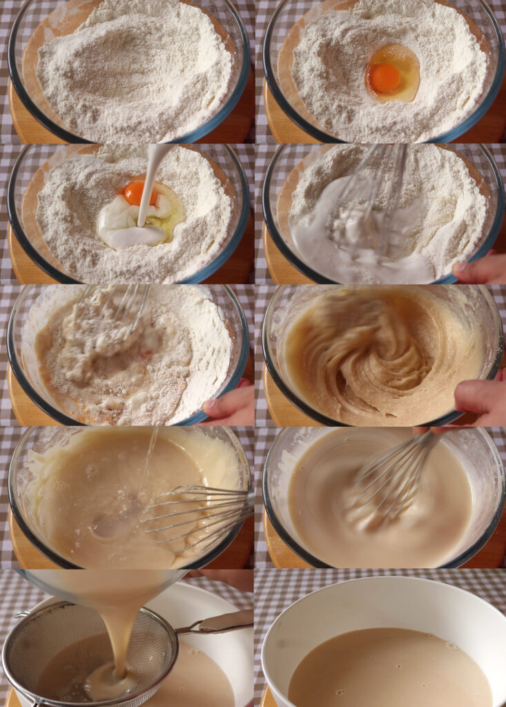 2.จากนั้นใส่ไข่ไก่ หัวกะทิ คนให้เข้ากันค่อยๆเทน้ำปูนใสลงไปนำมากรองพักแป้งไว้ 30 นาที