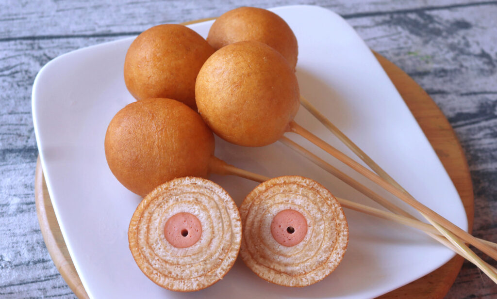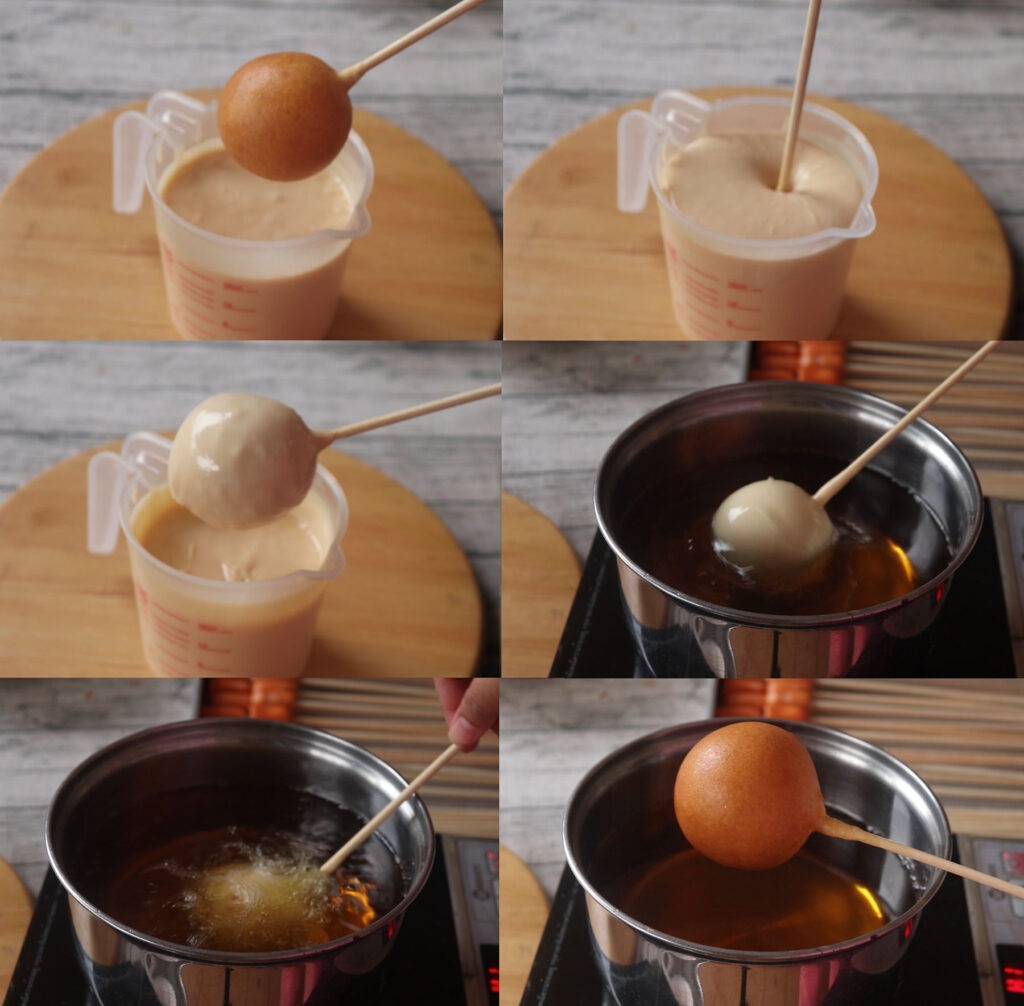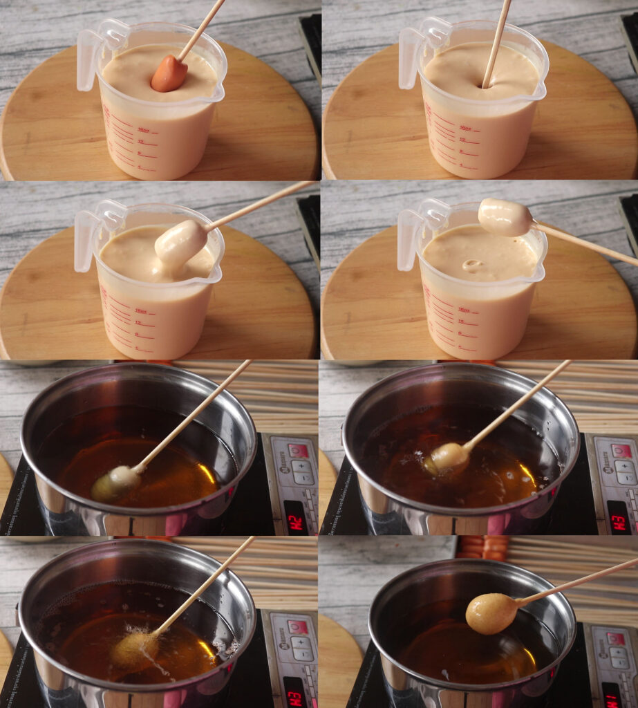 4.เสียบเสร็จนำไส้กรอกมาจุ่มแป้ง(รอบแรก) ทอดในน้ำมันที่ร้อน ทอดด้วยไฟกลาง เวลาทอดให้หมุนไม้ไปด้วยขนมจะได้เป็นทรงกลมสวยงาม ทอดจนสุกเหลือง