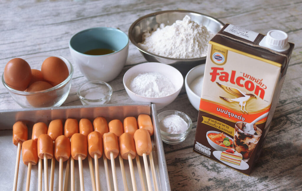 3.จากนั้นเรามาเตรียมใส้กรอกกันค่ะ นำไส้กรอกมาเสียบไม้