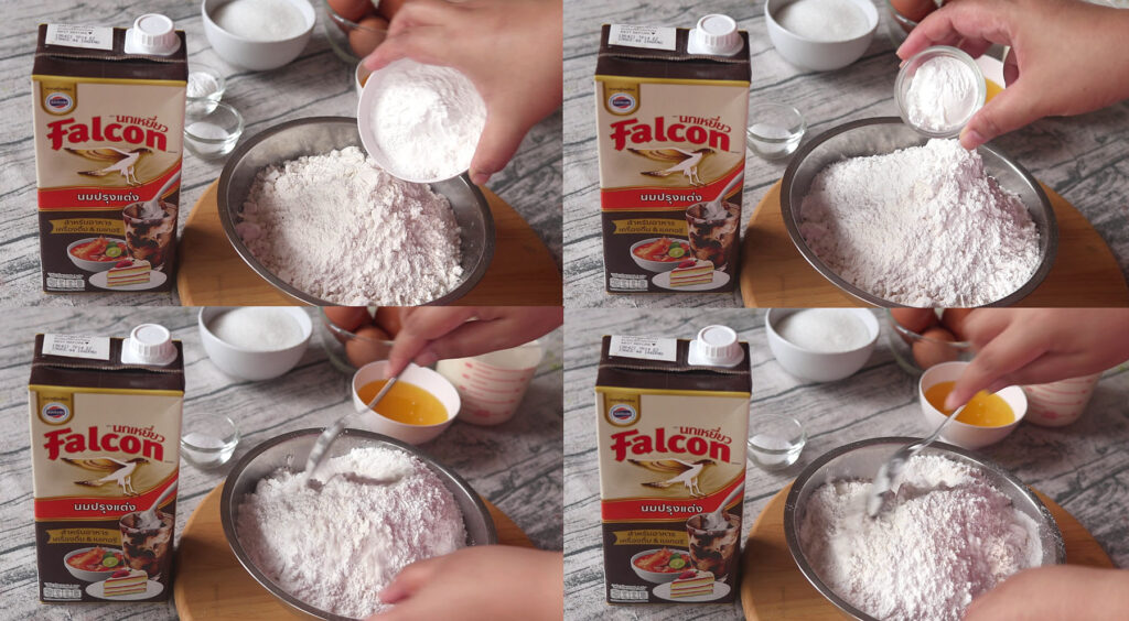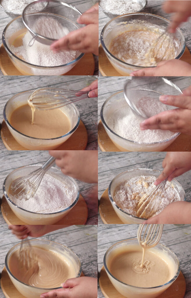 2. ผสมแป้งสาลีเอนกประสงค์ แป้งข้าวจ้าว และผงฟูเข้าด้วยกัน ร่อนแป้งลงไป(แบ่งร่อนประมาณ 2-3 รอบ) จากนั้นตะล่อมให้ส่วนผสมเข้ากัน