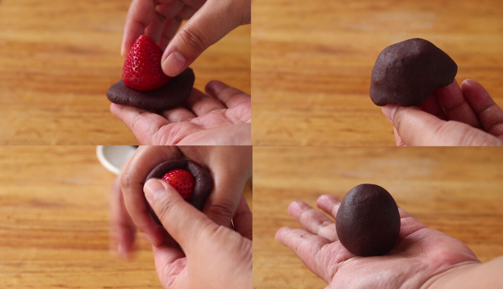 6.จากนั้น เตียมไส้ถั่ว แล้วห่อด้วยสตรอเบอร์รี่