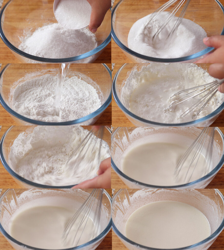 2.ผสมแป้งข้าวเหนียว+แป้งข้าวเจ้า + แป้งมัน +น้ำตาลทราย คนให้เข้ากัน แล้วทะยอยใส่น้ำลงไป แบ่งใส่ 2 -3 ครั้งแล้วคนจนเข้ากัน