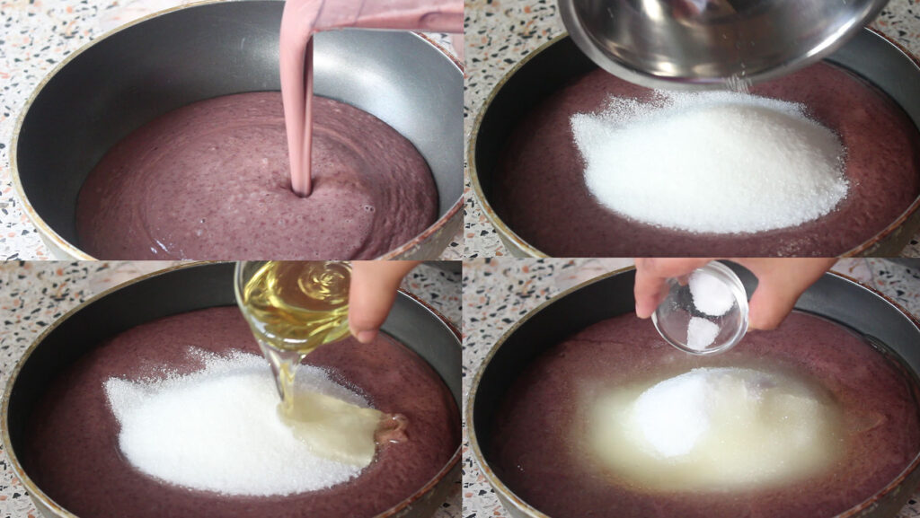 2.นำถั่งแดงไปปั่นให้ละเอียด ความละเอียดแล้วแต่ชอบเลยนะคะ เติมน้ำที่ต้มถั่วแดงลงไป หรือจะเป็นน้ำเปล่าก็ได้ค่ะ ใส่น้ำแค่พอปั่นแล้วไม่หนืดมาก ใส่น้ำตาลทราย +น้ำมันพืช+เกลือป่น