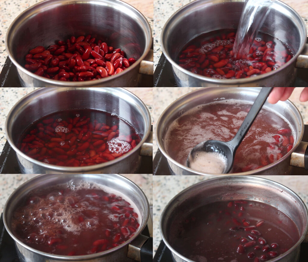 1.ล้างถั่วแดงให้สะอาดแล้วแช่ทิ้งไว้ข้ามคืน ต้มด้วยไฟกลางจนเดือดแล้วปรับเป็นไฟอ่อนต้มประมาณ 1.30 ช.ม.-2 ช.ม. ช้อนฟองออกด้วยนะคะ พอถั่วแดงเปื่อยแล้วก็พักให้อุ่นลงหรือจนเย็น