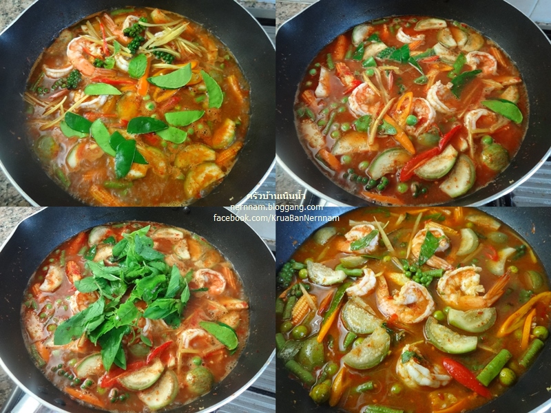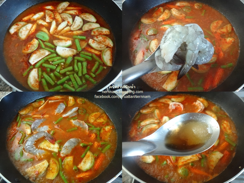 3. เมื่อน้ำแกงเดือด ใส่มะเขือเปราะ ข้าวโพดอ่อน ถั่วฝักยาว ลงต้มพอสุก (ใครชอบผักนิ่มก็ต้มนานหน่อย)ใส่กุ้งลงต้มพอสุก (ถ้าสุกเกินไปกุ้งจะเนื้อแข็งทานไม่อร่อย) ปรุงรสด้วยน้ำปลา น้ำตาลทราย คนพอเข้ากัน