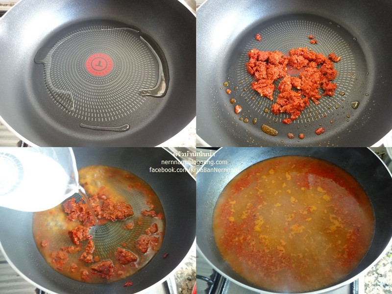 2. ตั้งกระทะใส่น้ำมันพืชพอร้อน นำน้ำพริกแกงป่าผัดพอสุก เติมน้ำเปล่าคนให้เข้ากัน