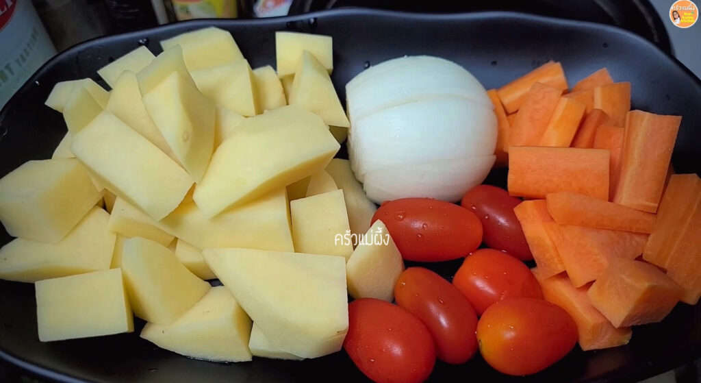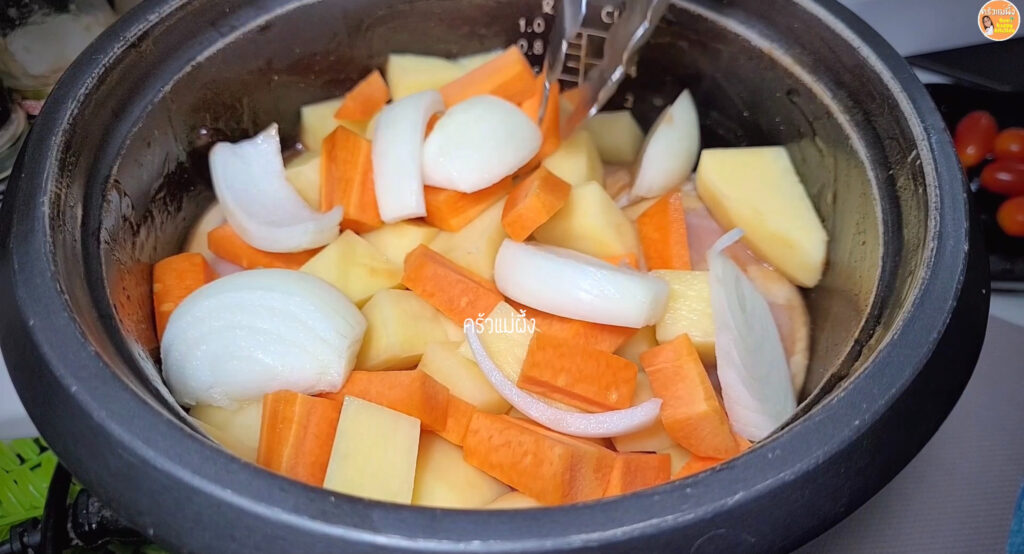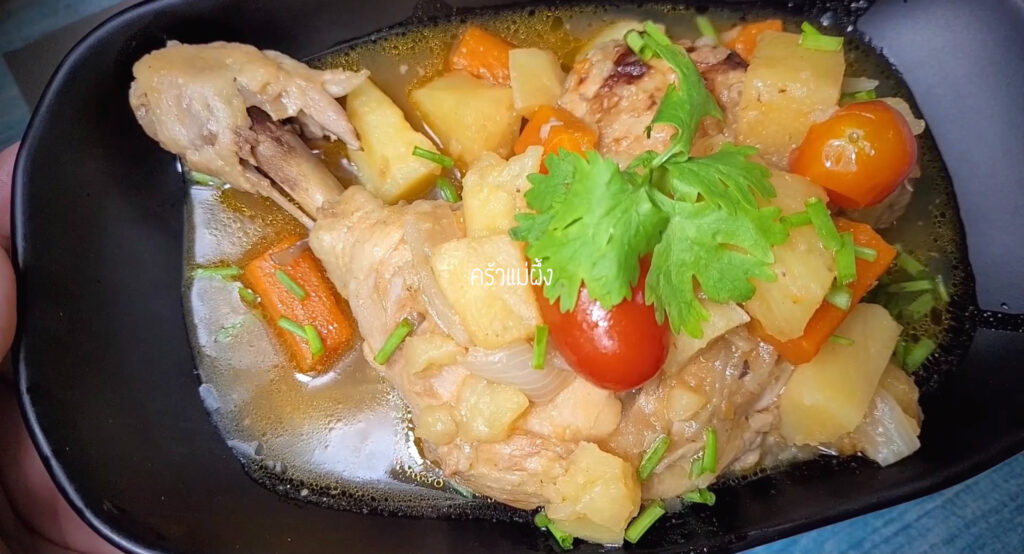 4.เมื่อผัดไก่จนได้ที่แล้ว ใส่ผักต่างๆ และสับปะรดลงไป จากนั้นใส่น้ำ ตุ๋นไว้ประมาณ 25-30 นาที จนไก่เริ่มนุ่ม
