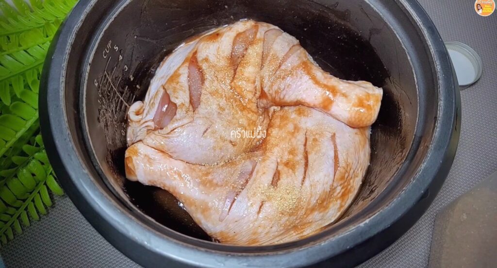 3. นำไก่ที่หมักเตรียมไว้ไปผัดในหม้อหุงข้าวจนหอม
