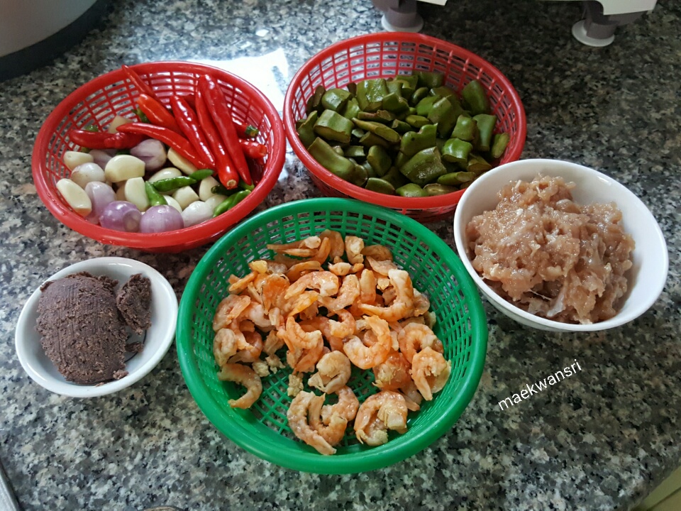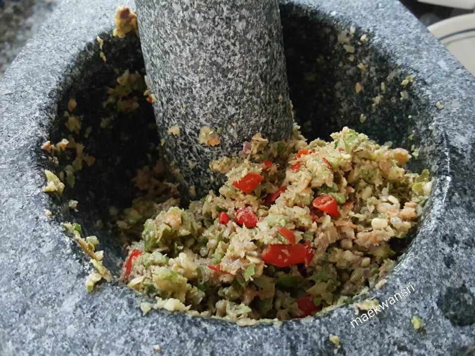 1.โขลกมะขามอ่อน กระเทียม หอมแดง พริกขี้หนู กุ้งแห้ง กะปิ รวมกันให้ละเอียด
